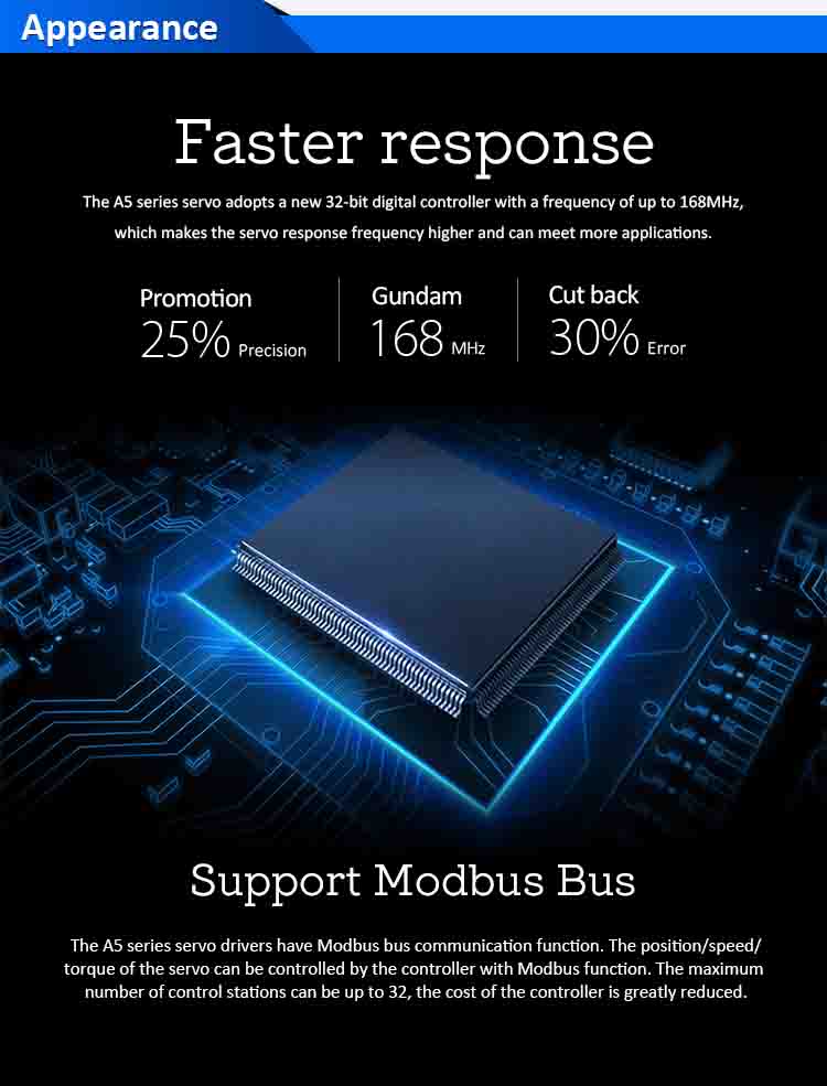 Šis rinkinys pristatotikslus padėties grįžtamasis ryšys, ABZ prieauginio kodavimo signalai, STO funkcinė sauga, irstabilus AC servo vairavimo efektyvumas, užtikrinantis puikų greitį, sukimo momentą ir padėties nustatymo tikslumą.