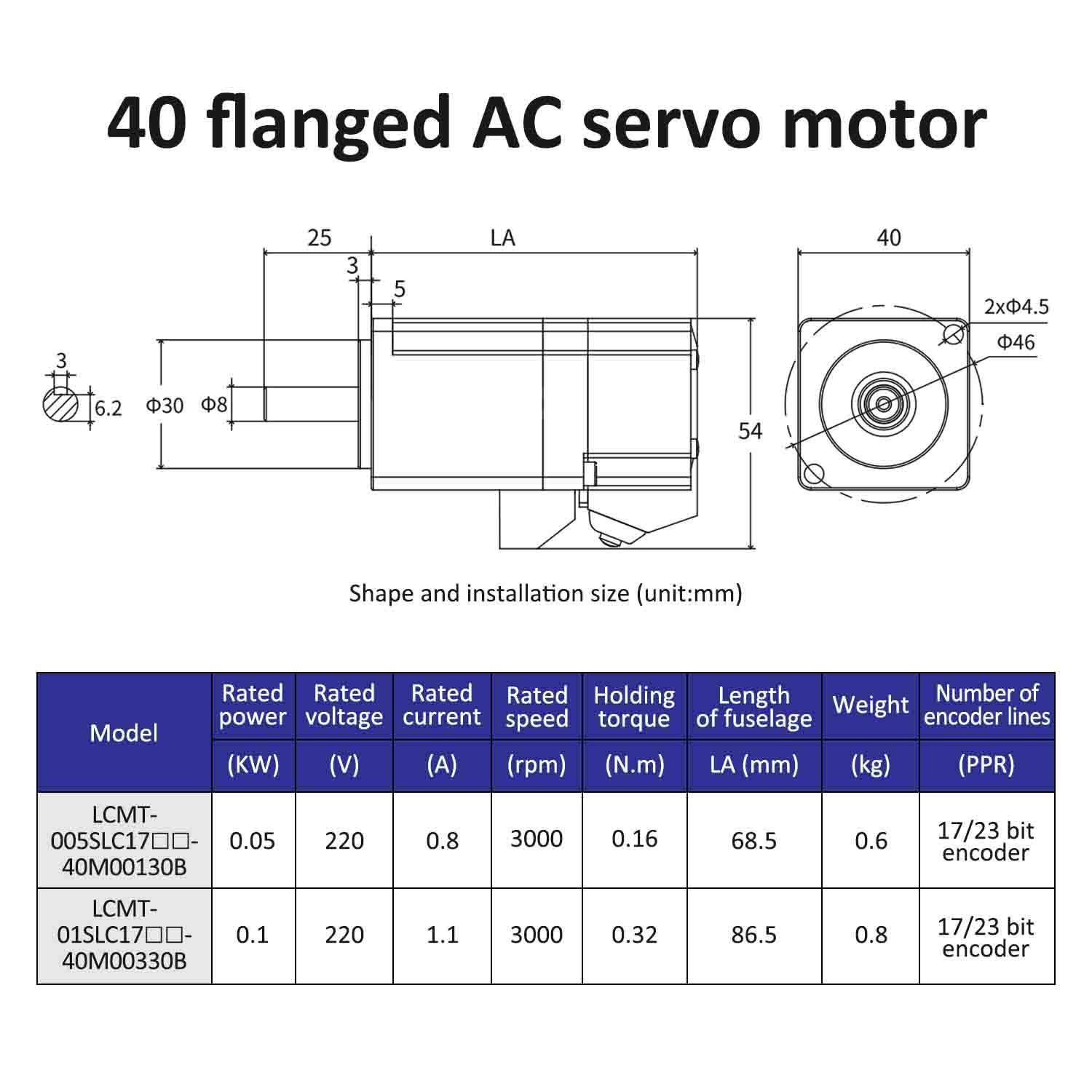 | Variklio modelis | LCMT-005SLC17-40M00130B | LCMT-01SLC17-40M00330B |