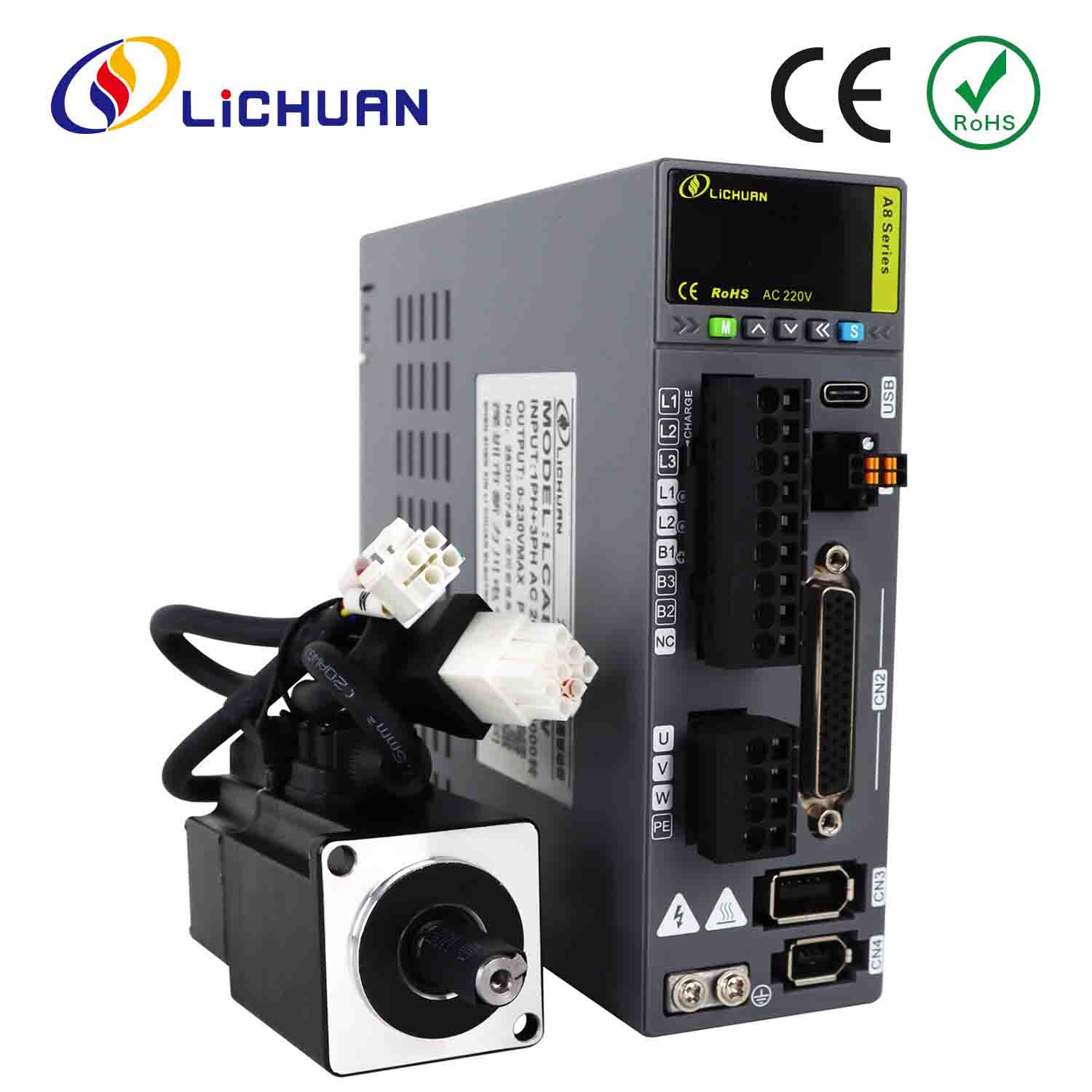 Lichuan kintamosios srovės servo variklio tvarkyklių rinkinys A8 Didelio tikslumo STO ABZ 1000W 1KW 3.2N.m 220V 5.8A 2500/3000RPM IP65