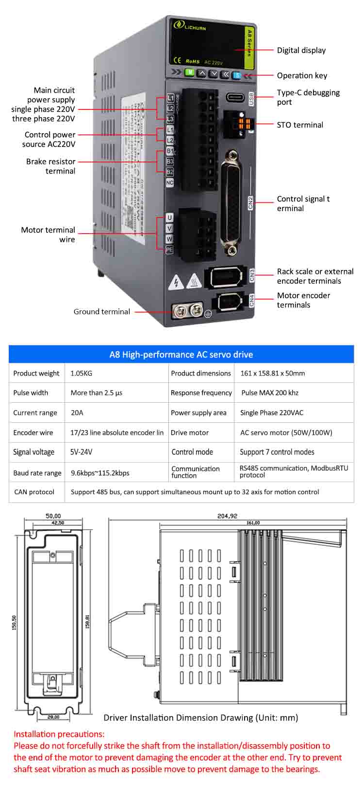 | Produkto pavadinimas | Lichuan A8 didelio tikslumo STO ABZ kintamosios srovės servo variklio tvarkyklių rinkinys |
